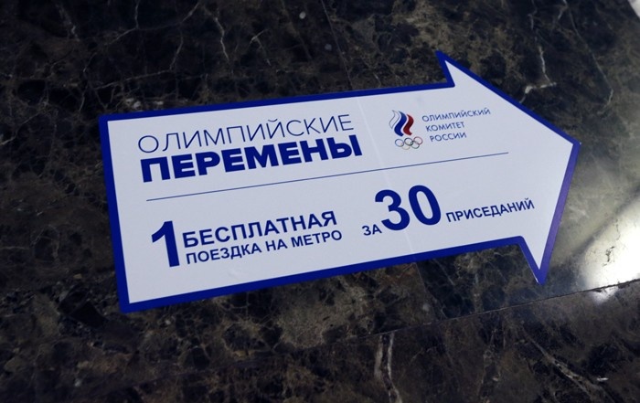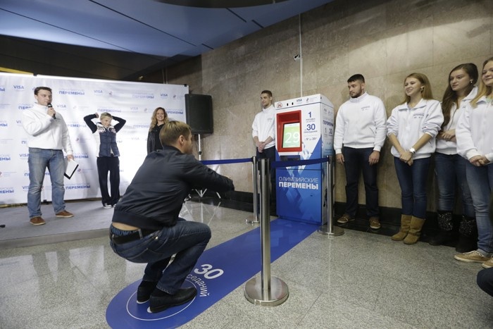 Нестандартный билетный автомат с логотипом сочинской олимпиады появился сегодня в вестибюле станции метро «Выставочная», сообщает «Эхо Москвы». Чтобы заработать билет, нужно встать на специально размещенные у автомата следы ног и выполнить 30 приседаний за 2 минуты.