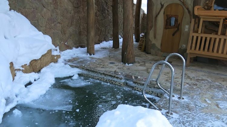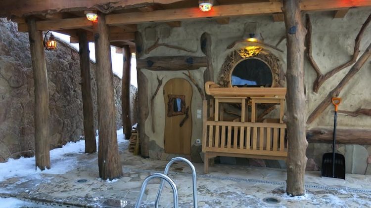 Теперь пройдемся к русской баньке. Для этого надо выйти на улицу. Она стоит отдельно, на берегу рукотворного ручья, выложенного кафелем.
