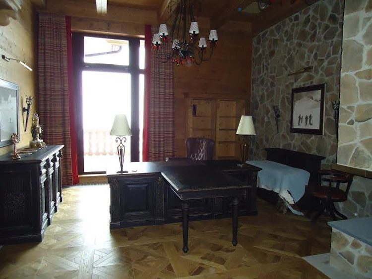 Это хозяйский кабинет. На стенах фотографии: Путин и Медведев на горных лыжах. Обратите внимание на Т-образную форму письменного стола: это стол не писателя какого-то, а руководителя.
