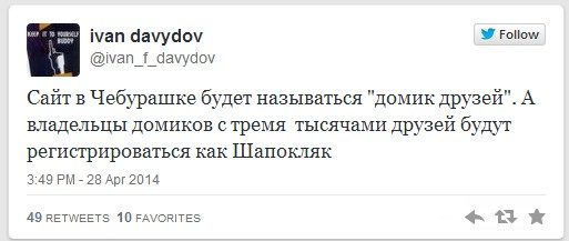 «Сайт в Чебурашке будет называться „домик друзей“. А владельцы домиков с тремя тысячами друзей будут регистрироваться как Шапокляк», — пишет в своем Twitter замглавного редактора Slon.ru Иван Давыдов.