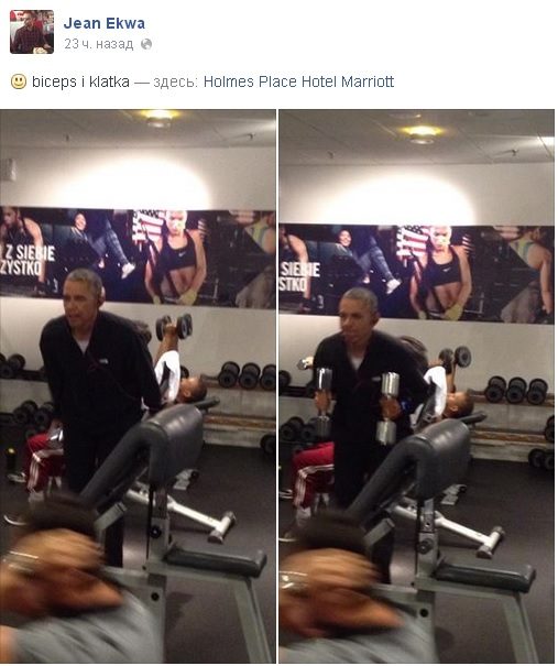Видеоролик, на котором Барак Обама выполняет упражнения в тренажёрном зале в варшавской гостинице Mariott появился в Сети сегодня днём. Одновременно с ним пользователь Facebook Jean Ekwa также разместил на своей странице две фотографии американского лидера с гантелями в руках. Как пишет Daily Mail, тренировка продлилась примерно полчаса.