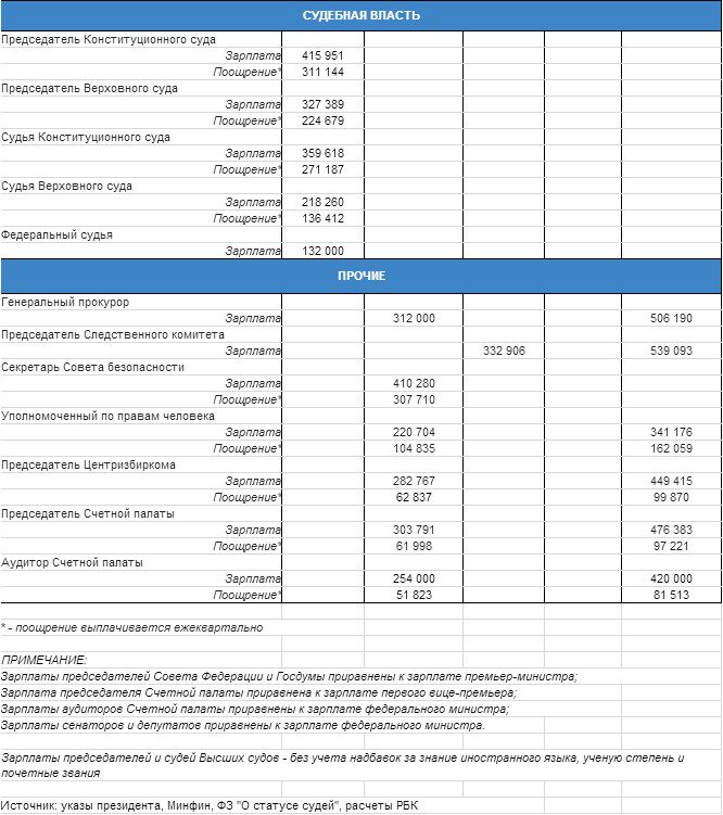 Почти 26 000 российских чиновников имеют статус лиц, замещающих государственные должности, подсчитало РБК. 25 015 из них — федеральные судьи. Зарплаты высших российских чиновников (за исключением федеральных судей) были резко увеличены в 2012-14 годах. Сейчас, по подсчетам РБК, они зарабатывают от 132 тыс. руб. (средняя зарплата федерального судьи) до 715 тыс. руб. (президент).