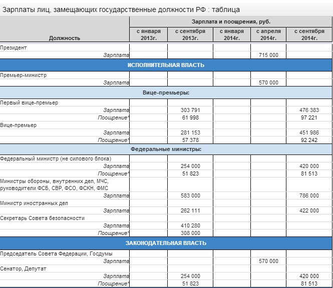 С 1 сентября лидерами по величине зарплат станут федеральные министры-силовики (министры обороны, внутренних дел, по чрезвычайным ситуациям, руководители ФСБ, СВР, ФСО, ФСКН, ФМС), чьи зарплаты будут повышены до 786 000 руб. согласно прошлогоднему указу Путина.