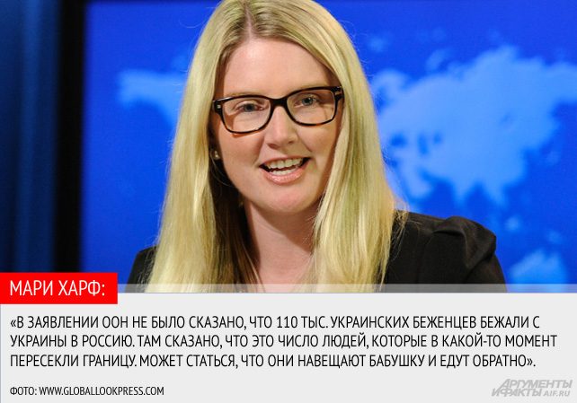 В Госдепе не верят, что 110 тысяч человек бежали в Россию из-за конфликта на Украине, этих людей никак нельзя отнести к категории беженцев. Об этом заявила Мари Харф, предположив при этом, что эти люди просто приехали погостить на время, чтобы навестить своих бабушек.