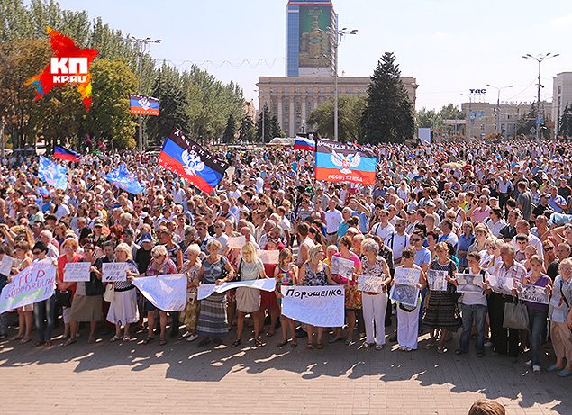 С утра горожане начали сходиться на площадь — посмотреть на «парад сожженой техники», а к двум часам дня перед памятником Ленина собралось до пяти тысяч человек. Для вымершего Донецка это колоссальная цифра, которая шокировала даже самих собравшихся. Нам говорили, что многие хотели приехать, но просто побоялись — утренний обстрел больницы показал, что украинская артиллерия спокойно «достает» до центра города. Не приходилось рассчитывать и на то, что люди, круглосуточно обстреливающие жилые кварталы, не воспользуются таким удобным случаем истребить одним махом несколько сотен «террористов». Ровно в два часа ведущий заявил, что антифашистский митинг объявляется открытым и сказал несколько горьких слов: