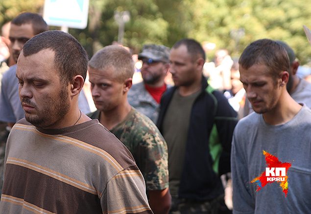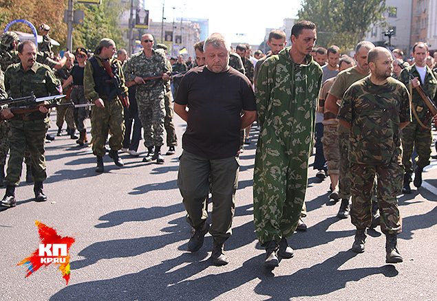 Снизу, по вымершей улице Артема, к площади двинулись какие-то шеренги серых людей. Площадь сначала выстроилась молча вдоль тротуаров. Ополченцы встали в цепь, охраняя колонну. Все громче и громче горожане скандировали «Фашисты!» Наконец, у какой-то женщины не выдержали нервы и в пленных полетела бутылка минералки, ни в кого не попала и лопнула на асфальте. Тем, кто шагал впереди — досталось меньше. Конвой в голове колонны был плотнее. Девушка-ополченка со старой винтовкой СВТ, времен Великой Отечественной и примкнутым ножевым штыком пускала полированной сталью зайчики. Казалось, что эта сцена из прошлого. И даже «фашисты» были такие же — небритые мужики средних лет с «полевым» загаром. Одетые кто во что горазд — от советского камуфляжа «березка» до бундесверовского флектарна.