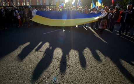 Все чаще слышится объединяющий лозунг «Слава Украине, слава России!» На прошлом «Марше мира», посвященном событиям в Крыму, более популярным был лозунг Майдана — «Слава Украине, героям слава!»