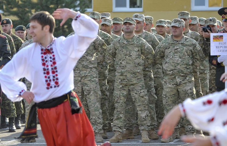Вот так и будет, как на фото украинцы будут гарно спивать и плясать, а воевать будет НАТО. Был у меня пекинес, на прогулке кидался на навороченных ротвейлеров, а потом с разбегу прыгал на руки, предлагая тем самым решить вопрос с ротвейлером уже тебе. Вот она политика Украины.