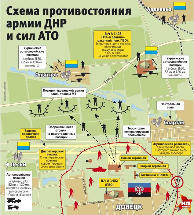 Как рассказали корреспондентам «КП» командиры-разведчики министерства обороны ДНР, аэропорт занимает исключительно выгодное географическое положение. Он находится на плоском плато, которое нависает над Донецком и прилегающей местностью. Благодаря этому ближайшая точка, куда может подойти ополчение — так называемая Путиловская развязка, — находится в 1,5 километра от терминалов аэропорта. Мы выехали с разведчиками на эту развязку, с помощью квадрокоптера сделали видеосъемку аэропорта, и спустя десяток минут были замечены, обстреляны снайперами и накрыты залпом из минометов. Автоматические гранатометы били из терминалов, а минометы — с территории в/ч А-1428 156-го зенитно-ракетного полка ПВО Украины. Эта часть примыкает к взлетному полю и буквально нашпигована капонирами, бункерами, тоннелями и укрытиями, в том числе и противоатомными. На территории части размещается артиллерия, которая в последние месяцы обстреливала Донецк и подавляла всю активность ополчения в окрестностях аэропорта. Так же артиллерия обеспечивала «коридор снабжения» группировки, сидящей в аэропорту, — перерезать снабжение ополченцы так и не смогли. Блокпосты, которые выставлялись ночью, утром уничтожались артогнем. И подавить артиллерию средствами контрбатарейной борьбы у ополченцев тоже не получилось. В СССР военные объекты строить умели и бетона не жалели.