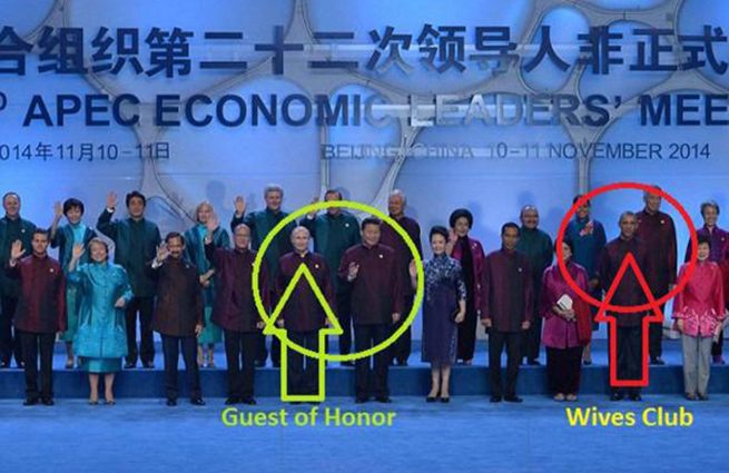 Особо едко над Обамой посмеялись из-за того, что во время фотосессии он оказался вдали от остальных президентов: в то время как большинство глав стран-участниц саммита держались друг рядом с другом, Обама затесался в группу первых леди. Фотография с подписью «Клуб жен» и указывающей на главу США стрелкой быстро разлетелась по Интернету. Отметим, что на этом же снимке президент России Владимир Путин, стоящий рядом с председателем КНР Си Цзиньпином, подписан как «Почетный гость».