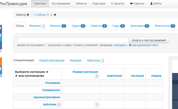 Для начала я решил поинтересоваться квалификацией юристов, получающих зарплаты в ФБК. Судебную практику юриста (то есть, дела в которых он участвовал) легко проверить, зайдя на портал «Росправосудие». Вот что выдал нам данный ресурс относительно главного юриста организации Любови Соболь: