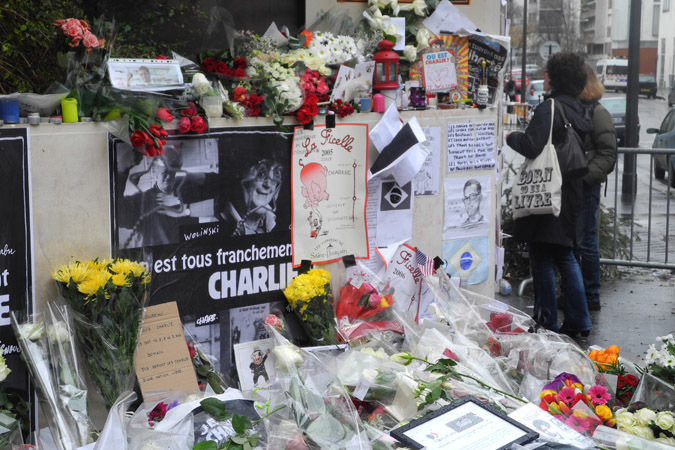 Вход на улицу Николя-Аппер, где располагается редакция сатирического журнала «Шарли Эбдо», перекрыт одним-единственным полицейским и весь завален цветами. Повсюду пылают свечи и прямо на тротуаре лежат связки цветных карандашей в память о погибших карикатуристах. Множество рисунков на стенах. На одном из них автоматчик целится в человечка с карандашом. Подпись под плакатом: «Ну, и кто из них храбрый?»