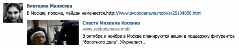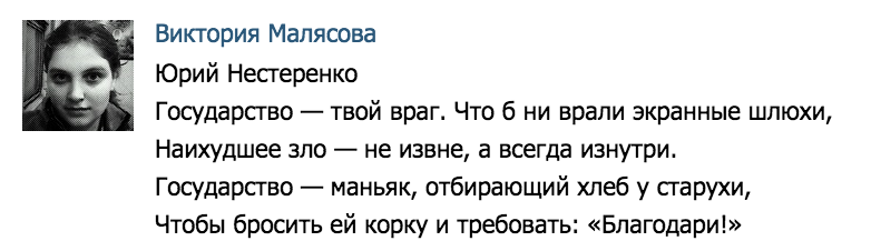 Виктория почему-то в ролике не представляется, а вот речь толкает. Ну, собственно, на скриншотах видно как Таня Коммунар приглашает Викторию на беседу, надо полагать, как раз о создании вышеупомянутого ролика. Кстати, отдельно понравилась запись на стене у Виктории с комментарием о том, что в России, кажется, майдан намечается. Ну а что плохого в том, чтобы желать своему государству революции? Ведь, по мнению Виктории, цитирующей поэтов, «государство — враг».