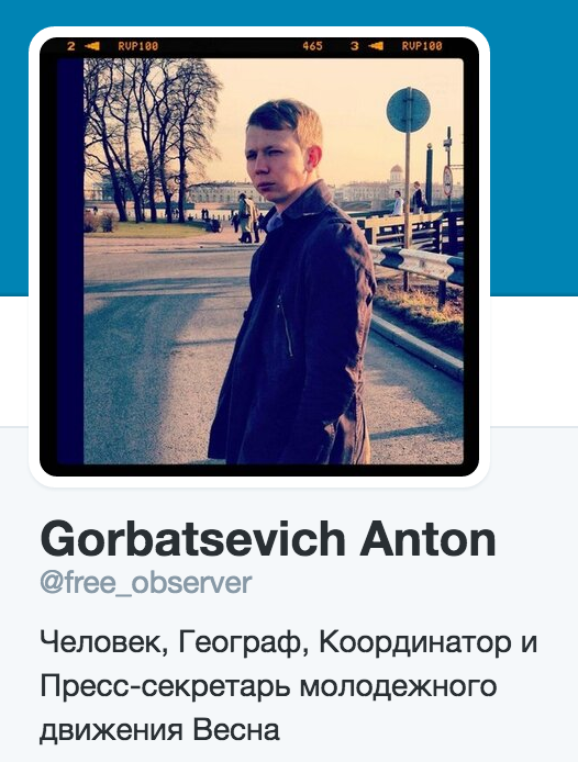 Судя по странице Вконтакте, Антону уже 26 лет. Как он может являться студентом мне непонятно. Но ладно, всякое бывает. Так вот Антон является пресс-секретарем молодежного демократического движения «Весна», бывших активистов молодежного «Яблока». Антона стоит призвать к ответу хотя бы за то, что он использует палку для селфи.