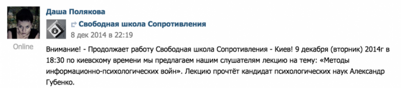 Даша — очень активная девочка. Ходит на манежку, ездит по ОВД, фотографируется с белыми лентами. Ну и еще находясь в Москве Даша успевает пиарить киевскую школу сопротивления, где обсуждаются методы ведения информационно-психологических войн. Пиарщики киевской школы сопротивления просят прощения у граждан Украины за все, что они сделали. И правильно.