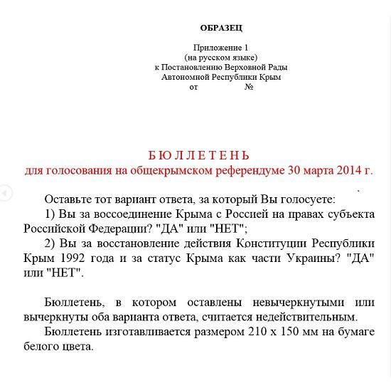 Во вложениях среди прочего и бюллетень с готовыми вопросами для референдума, и это притом что письмо это датировано 5 марта, в то время как Верховный Совет АР Крым принял положение о референдуме только 6 марта (любопытно, что когда в АП составляли документ, референдум еще планировалось проводить 30 марта, а не 16-го, что и видно по бюллетеню). Иными словами, задолго до голосования Крым уже де-факто управлялся Кремлем.