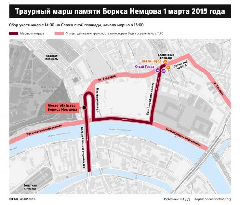 Траурный марш памяти Бориса Немцова пройдет от метро «Китай-город» к месту гибели политика в 15:00 в воскресенье, сообщил РБК соратник оппозиционера Алексея Навального Леонид Волков. По его словам, организаторы отзывают заявку на шествие в Марьино, а на траурное шествие подают отдельную заявку, которую согласует мэрия.