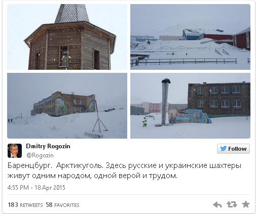 Также вице-премьер побывал в Баренцбурге — втором по величине населенном пункте архипелага. «Баренцбург. Арктикуголь. Здесь русские и украинские шахтеры живут одним народом, одной верой и трудом», — сообщил Рогозин.