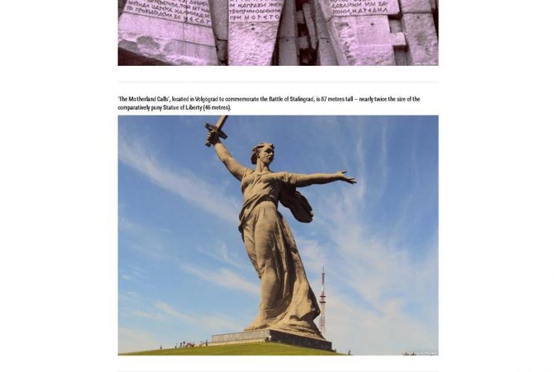 Как указывается на сайте, волгоградская фигура, достигающая в высоту 85 метров, в два раза больше Статуи Свободы. Они так и написали в статье издания Business Insider. Других аргументов они не привели. Стоит отметить, что список был опубликован менее чем за две недели до 70-летия Победы.