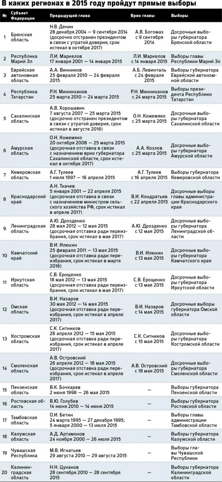 Путин дал возможность переизбраться, в том числе досрочно, назначив исполняющими обязанности, главам девяти регионов. Всего на сентябрь 2015 года выборы назначены в 20 регионах.