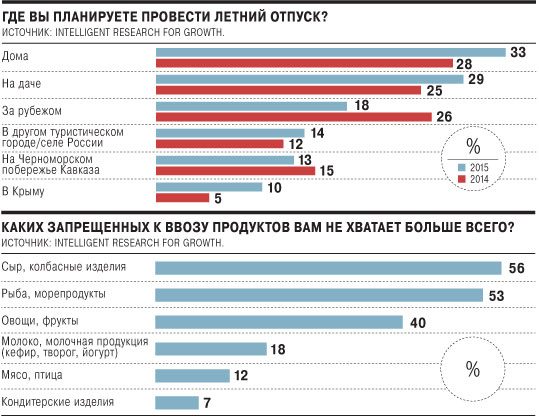 Наконец, 63% россиян решили снизить расходы на летний отдых. Так, 33% опрошенных говорят, что никуда не поедут в этом году, хотя прошлым летом дома оставались только 28% респондентов. Доля тех, кто решил ограничиться отдыхом на даче, выросла по сравнению с прошлым летом с 25% до 29%. Упало количество россиян, готовых выехать за границу или на Черноморское побережье Кавказа (Сочи, Туапсе, Анапа и т. д.) — с 26% до 18% и с 15% до 13%. Зато в два раза больше людей утверждают, что планируют ехать в Крым,— 10% по сравнению с 5% годом ранее.