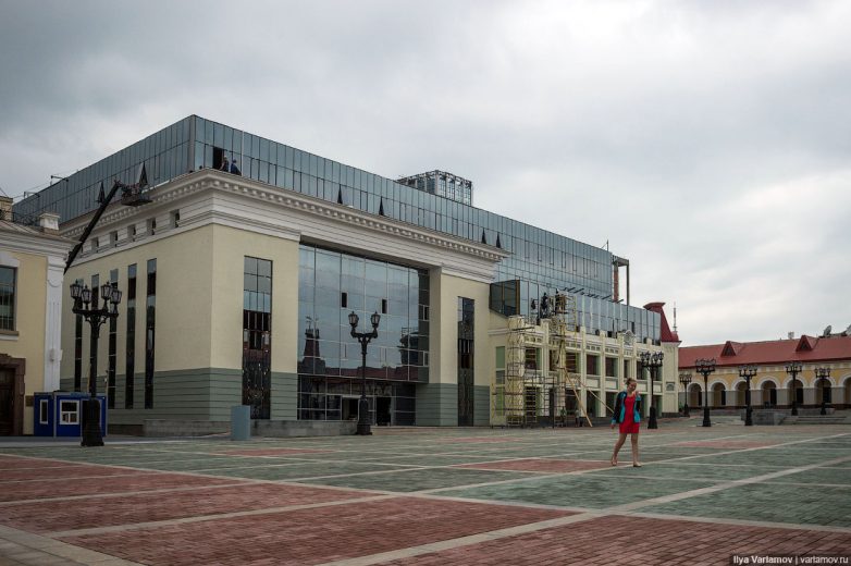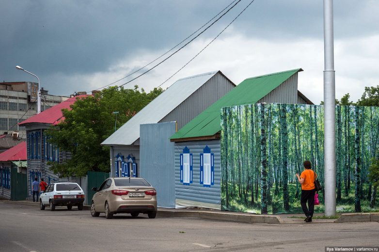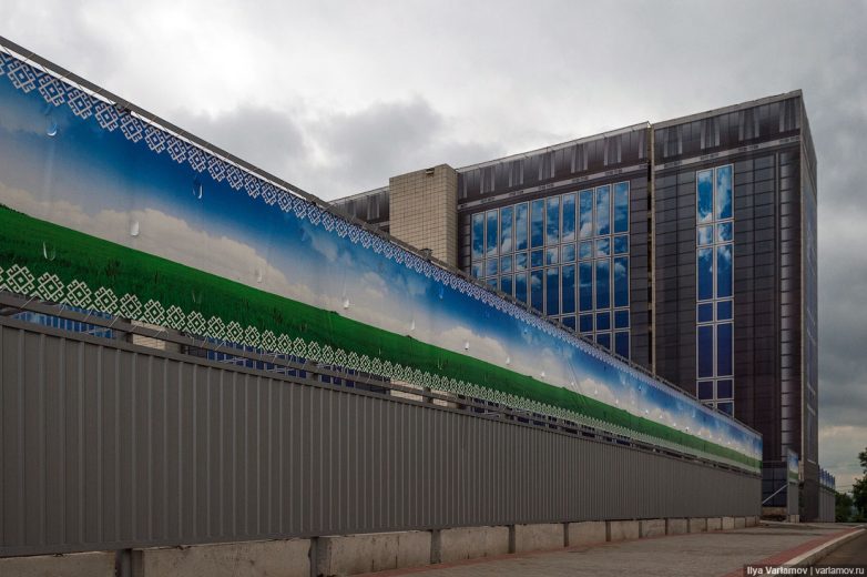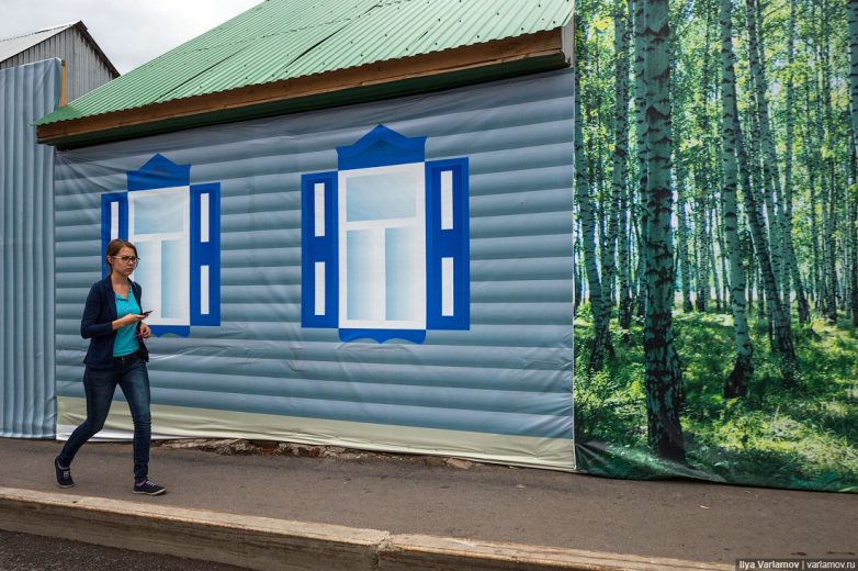 05. Так как привести город в божеский вид не успели, все неприглядные здания закрыли баннерами. Если где-то здания не хватало, его вновь построили из фанеры. По замыслу администрации Уфы, проезжающие мимо гости не должны заметить подвоха.