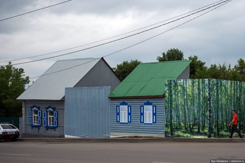10. Чтобы некрасивый дом не нарушал уфимской идиллии, его скрыли баннером с принтом леса. По одной из версий, город собирался выкупить территорию вместе с домом у его владельца. Говорят, хозяин дома запросил за землю 15 млн рублей, и мэрия от этой идеи отказалась. Тогда владелец якобы вырубил деревья, чтобы испортить вид из отеля. Недолго думая, власти решили завесить домик красивым баннером.