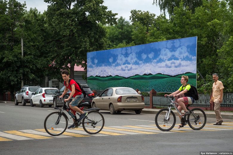 11. Стоит отметить, что уфимские власти мастерски научились подбирать картинки для своих заглушек. Иногда сразу и на распознать, что вдали не прекрасный газон, а забытый строительный вагончик.