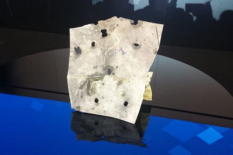 Фрагмент корпуса самолета, обстрелянного ракетой зенитного комплекса «Бук-М1», на пресс-конференции представителей концерна «Алмаз-Антей»