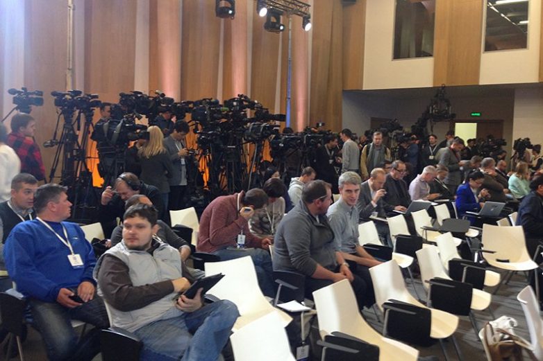 Организатор пресс-конференции — «Апостол-Медиа» Тины Канделаки. Мероприятие проходит в «Технополисе» на Волгоградском проспекте. В зале собрались десятки журналистов российских и международных изданий.