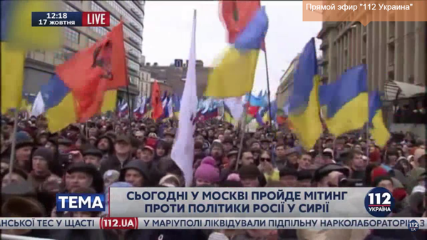 Отметим, что украинское ТВ показало митинг против операции ВКС России многотысячным, причем с десятками украинских флагов.
