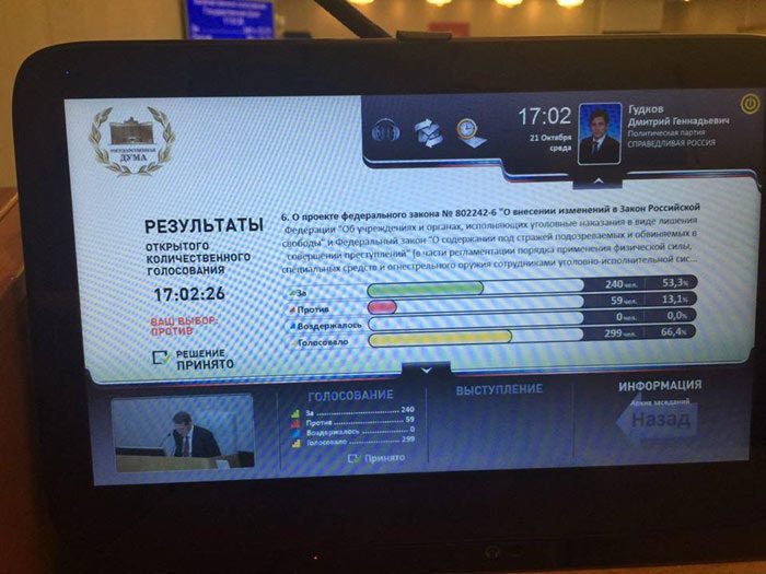 Редкий случай, когда депутаты задавали неудобные вопросы, а сразу две фракции – СР и КПРФ – и вовсе отказалась поддержать законопроект. Многие понимают, что узаконенное насилие – это опасно. Оказаться его жертвой может каждый, в том числе и тот, кто такой закон принимал.