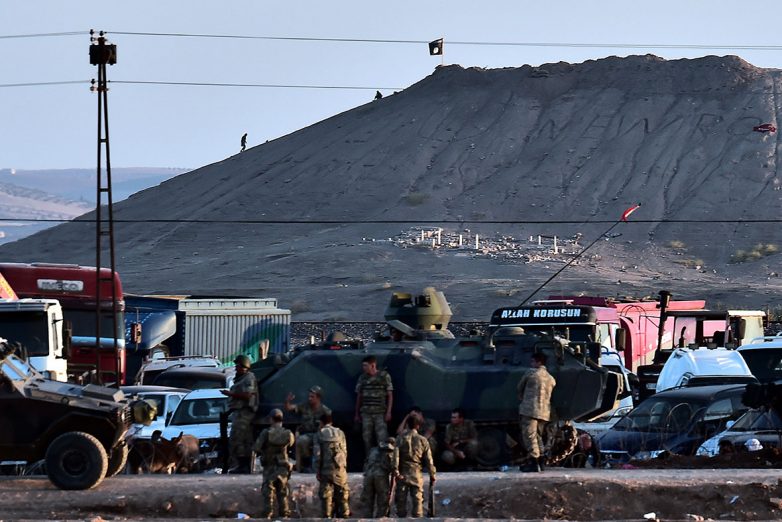 Турецкие солдаты на границе, на холме — боевики ИГ