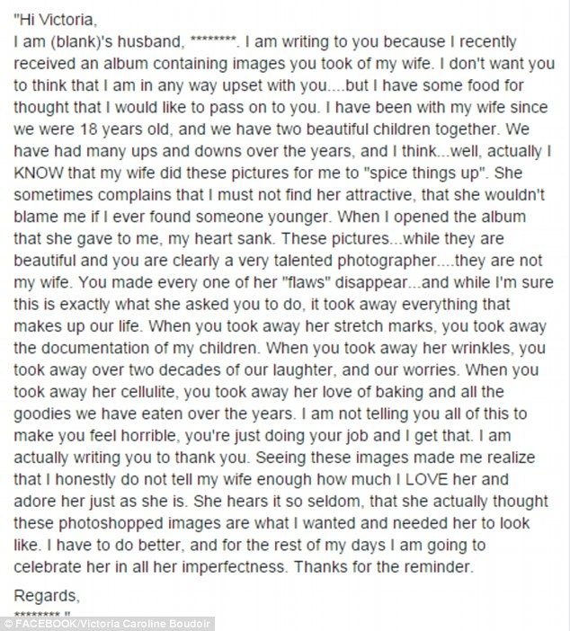 Виктория Хальтон — фотограф из Сан-Антонио, получила письмо от мужа одной из клиенток, для которой делала фотосессию. В этом письме мужчина жаловался, что Виктория совершенно зря отретушировала все недостатки его жены. Послание было таким невероятным, что фотограф опубликовала его в Сети (естественно, сохранив имя автора в тайне). Мысли мужчины, искренне любящего свою жену, вызвали много разных эмоций у пользователей Интернета.
