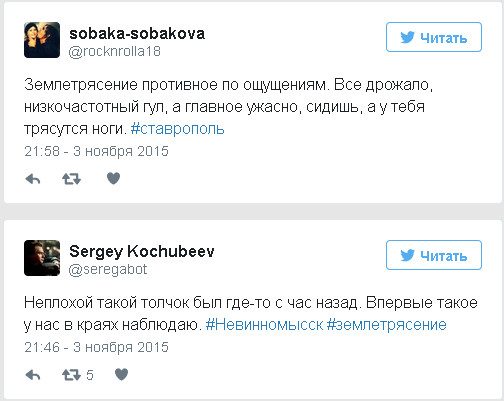 «МК в Ставрополе» сообщает, что жители многоэтажных домов почувствовали, как качается мебель и шатается пол. Трясло около минуты, однако, по словам очевидцев, люстры продолжали качаться и после этого еще несколько минут. Один из ставропольских очевидцев назвал это землетрясение самым сильным за 36 лет его жизни в городе.