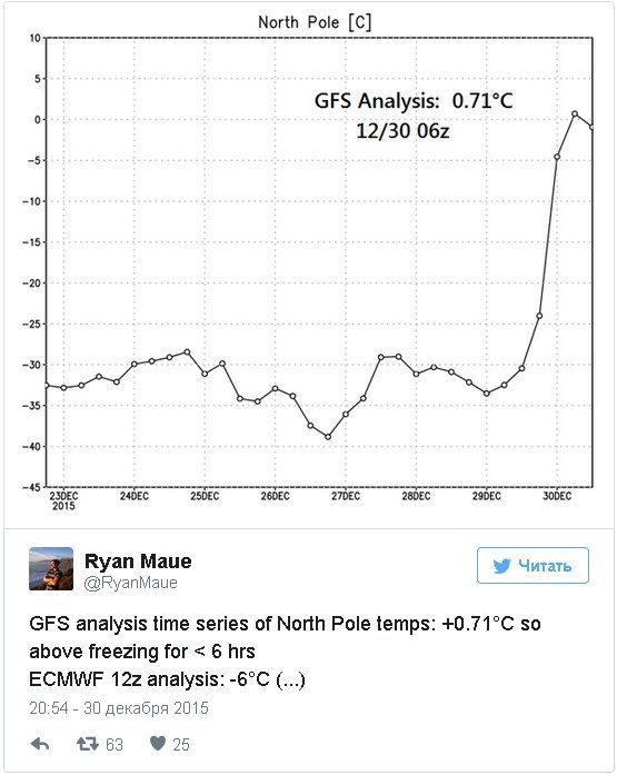 30 декабря температура на огромной территории вокруг Северного полюса колебалась между минус одним и плюс полутора градусами по Цельсию. Бакен 64760, расположенный на широте 87,45 градуса северной широты, показал максимум — 0,7 градуса.