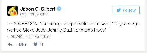 «БЕН КАРСОН: Вы знаете, Иосиф Сталин как-то сказал, «10 лет назад у нас были Стив Джобс, Джонни Кеш и Боб Хоуп» (популярная шутка с игрой слов о том, что 10 лет назад в США не было проблем с трудоустройством и благосостоянием, а население питало надежды на будущее. — RT).