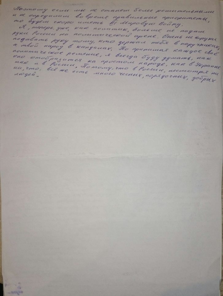 И я, теперь уже как политик не подам руки России на политической арене. Очень не с руки подавать руку тому, кто держал тебя в наручниках, а твой народ в кандалах. Но принимая каждое свое политическое решение, я всегда буду думать, как оно отобразится на простом народе, как в Украине, так и в России. Потому что в России, несмотря ни на что, все же есть много честных, добрых и порядочных людей.