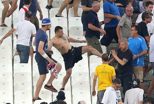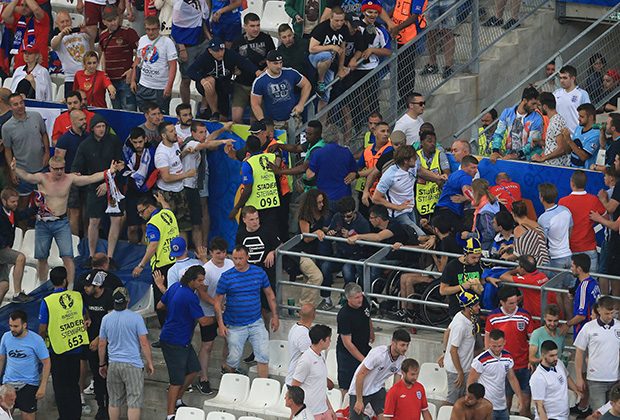 В субботу, 11 июня, сборные Англии и России сыграли вничью (1:1) в стартовом матче группового этапа Евро. Встреча проходила в Марселе, до игры в центре города произошли столкновения российских и английских фанатов. После окончания поединка группа россиян устроила беспорядки на секторе болельщиков англичан
