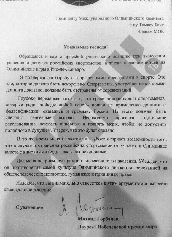 Кроме того, Горбачев в письме Баху рассказал, что его «беспокоит и глубоко огорчает» возможность того, что в случае отстранения российских спортсменов от Олимпиады вместе с виновными будут наказаны невиновные.