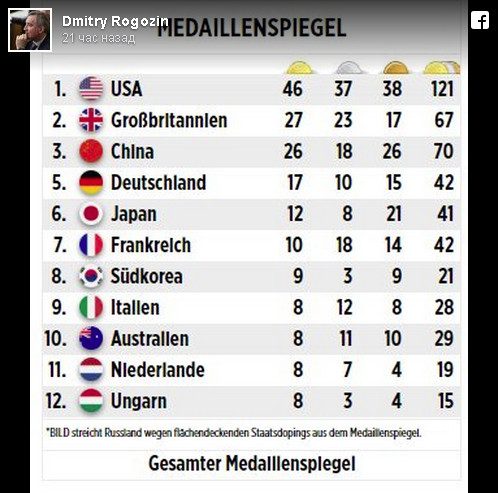 Рогозин назвал газету Bild русофобом и предположил, что для нее Россия — «как 13-й ряд некоторых суеверных авиакомпаний».Еще до Олимпиады редакция Bild предупреждала, что, если российскую команду допустят до Игр в Рио, она намеренно не будет включать ее в медальный зачет. В итоговой таблице таблоида, которую опубликовал Рогозин в Facebook, есть приписка, согласно которой Bild вычеркнул Россию из таблицы из-за «государственной программы допинга».