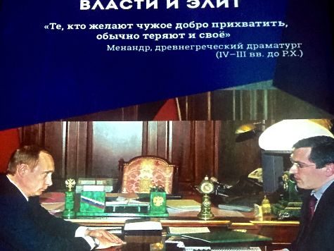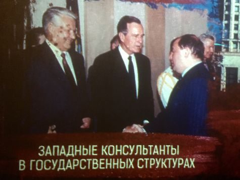 Рассказ о неудавшихся реформах сопровождается изображениями Чубайса, пробравшихся во власть олигархов, а также фотографией Ельцина, Буша и Егора Гайдара, под которой стоит совсем уж неприличная подпись «Западные консультанты в государственных структурах».