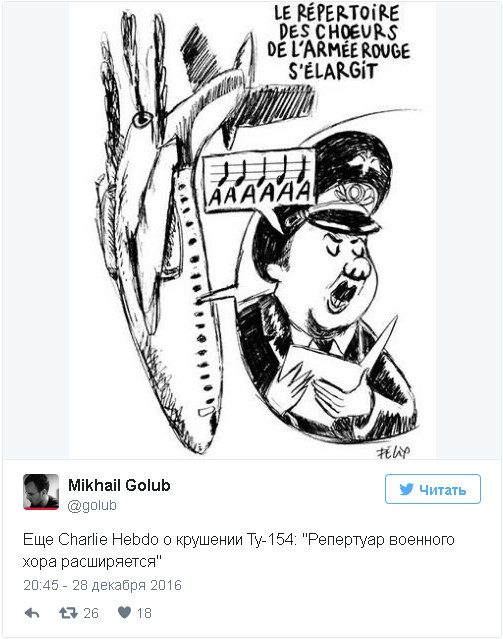 Французский сатирический журнал Charlie Hebdo в номере от 28 декабря опубликовал две карикатуры на крушение российского самолета Ту-154 в Черном море.