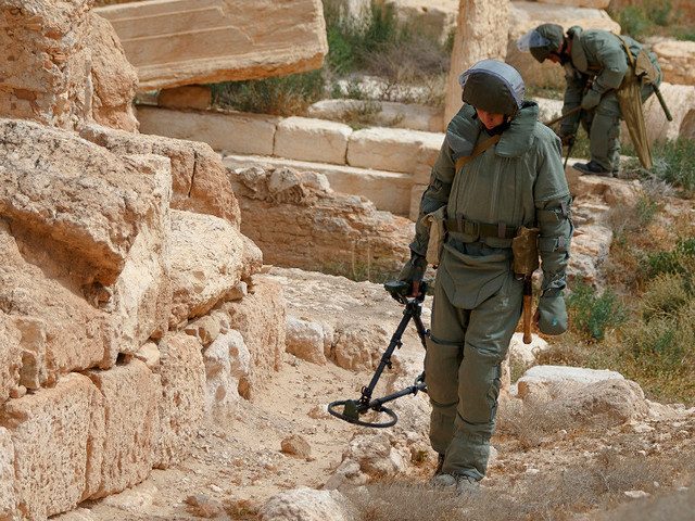 Передовой отряд российских саперов прибыл на авиабазу «Хмеймим» в Сирии 3 декабря. Туда были направлены наиболее подготовленные специалисты с опытом подобных операций, в том числе в Пальмире. В состав отряда вошло кинологическое подразделение. В Генштабе ВС РФ уточняли, что в разминировании Алеппо будет задействовано в общей сложности более 200 военнослужащих и почти 50 единиц военной и специальной техники.