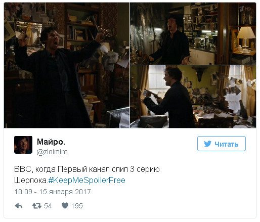 Создатели британского сериала «Шерлок» о расследованиях знаменитого детектива отреагировали на утечку эпизода сериала в русской озвучке на день раньше эфира, призвав зрителей дождаться трансляции на телевидении и не распространять спойлеры – подсказки, раскрывающие ключевые моменты сюжета.