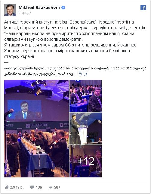 «На конгрессе Европейской народной партии на Мальте Саакашвили зарегистрировался делегатом от Грузии. О, какой лжец! От грузин бегает как заяц, чтобы его не посадили за убийства и коррупцию, а украинцам врет о любви к Украине», — прокомментировал Ляшко в Facebook.
