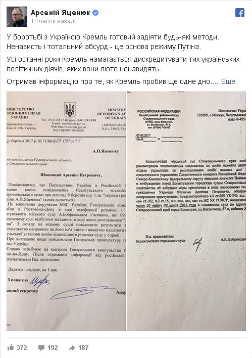 Сам бывший украинский премьер-министр уже прокомментировал решение Ессентукинского городского суда. «В борьбе с Украиной Кремль готов задействовать любые методы. Ненависть и тотальный абсурд — это основа режима Путина. Все последние годы Кремль пытается дискредитировать тех украинских политических деятелей, которых они люто ненавидят. Получил информацию о том, как Кремль пробил еще одно дно», — написал Яценюк на своей странице в Facebook.