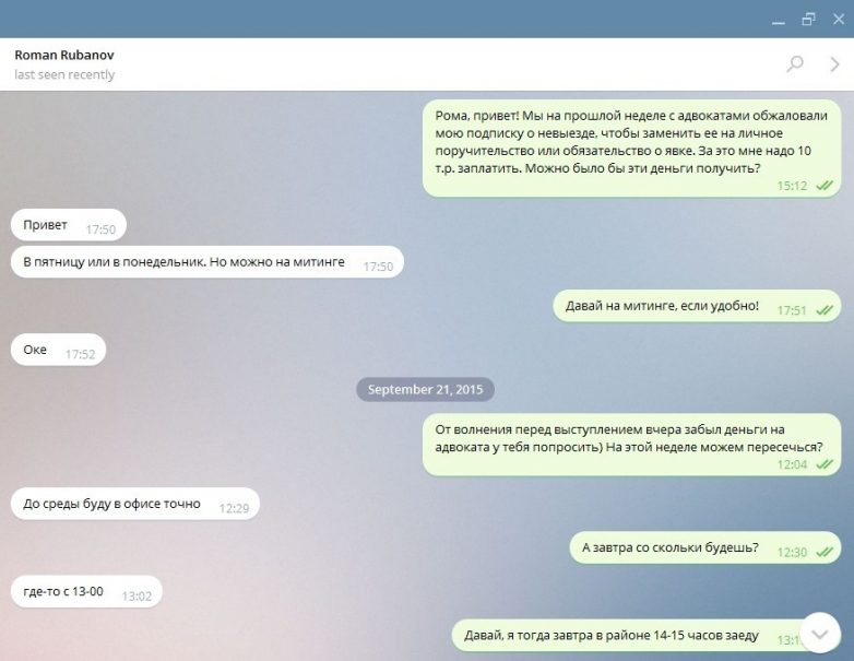 Получал деньги от Рубанова ещё один соратник Навального — Константин Янкаускас. Правда, в данном случае средства передавались в наличной форме, как видно из отрывка переписки в мессенджере «Телеграм».