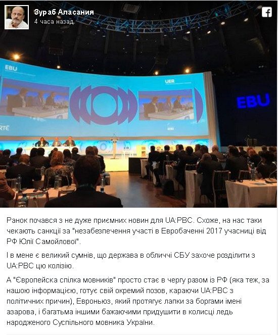 «Утро началось с не очень приятных новостей для UA: PBC. Похоже, нас таки ждут санкции за «необеспечение участия в «Евровидении-2017» участницы от РФ Юлии Самойловой». И у меня есть большое сомнение, что государство в лице СБУ захочет разделить с UA: PBC эту коллизию», — написал он на своей странице в Facebook.