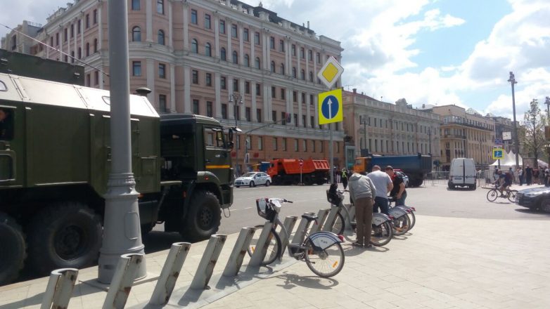 Сейчас попасть на Тверскую можно только при наличии специального пропуска. На улице находятся люди, которые монтируют декорации для проведения праздника «Времена и эпохи».